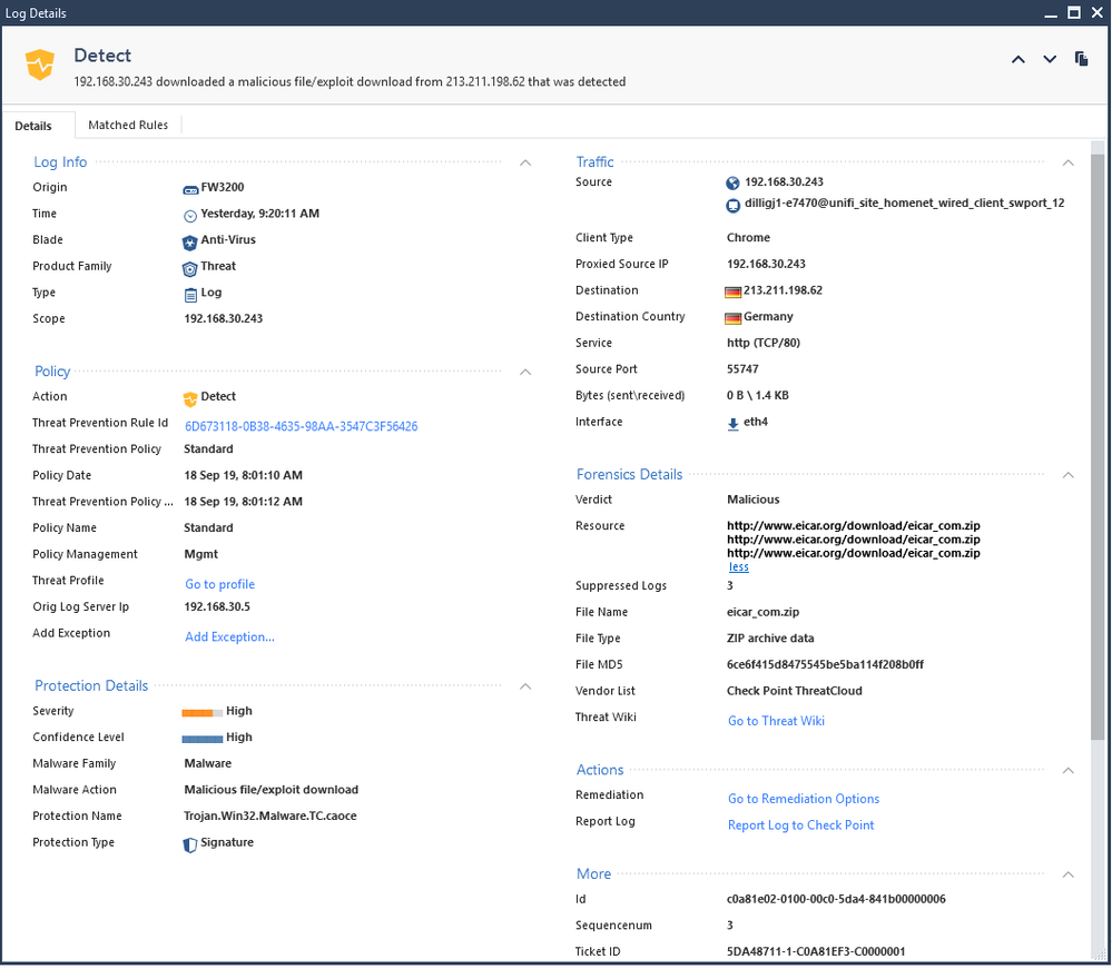 Example log inside SmartConsole showing machine identity. Using the search bar for logs you can also type any of the machine details to search the logs for clients connected to that Unifi site or switch.