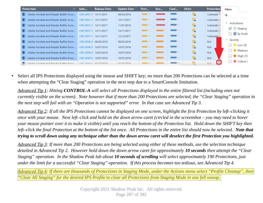 Here is the screenshot showing bulk-selection tips for IPS Protections from my IPS/AV/ABOT Immersion course, it was talking about bulk clearing of the Staging flag but the techniques apply here as well: